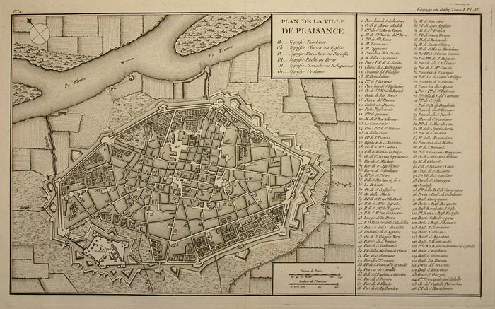 Planimetria della cittą tratta dal "Voyage en Italie", pubblicato dal Bourgeois nel 1799. Incisione all'acquaforte della Piazzaforte con l'elenco delle contrade, edifici pubblici.