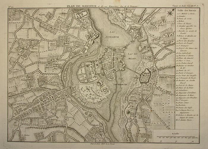 Planimetria della cittą di Mantova tratta dal "Voyage en Italie", pubblicato dal Bourgeois nel 1799.