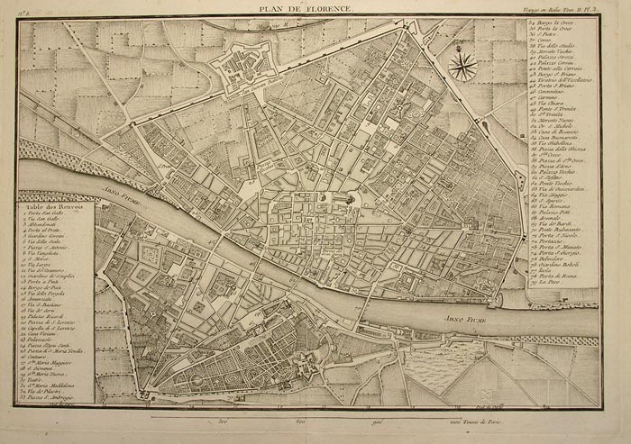 Pianta della cittą di Firenze, incisa all'acquaforte dal Bourgeois nel 1799 per il "Voyage en Italie"; con copiosa descrizione delle contrade e luoghi pubblici.