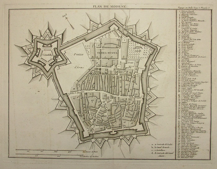 Pianta del 1799 da il "Voyage en Italie", incisa all'acquaforte dal Bourgeois che evidenzia le mura, la cittadella, e le fortificazioni. Legenda di vie e luoghi pubblici.