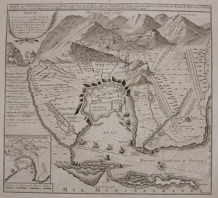 Portolano della fortezza di Tolone, assediata dagli eserciti imperiali nel 1712. E' accuratamente evidenziata la disposizione degli eserciti contrapposti.
